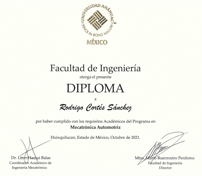 Certificate of Automotive Mechatronics Issued by the Faculty of Engineering of Anáhuac University during my Bachelor studies.