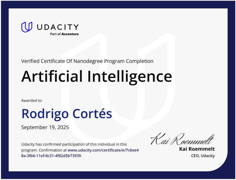 Certificate of Artificial Intelligence Nano Degree Issued by Udacity.