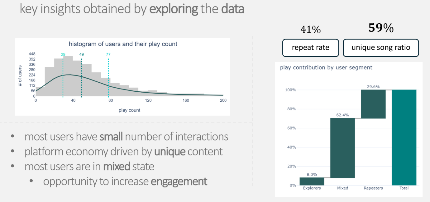 - Exploratory Data Analysis (EDA): Examined user behavior patterns, song popularity distributions, and sparsity issues to guide model selection.
