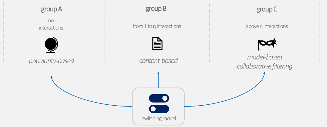 The solution is a switching hybrid recommender system. Users are divided into three groups by their play count: