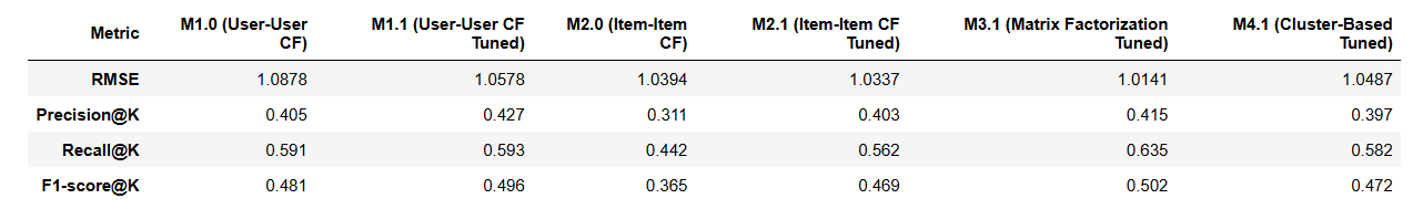 - Model Comparison: Benchmarked approaches using Precision@k, Recall@k, F1@k, and RMSE to identify trade-offs in accuracy, diversity, and scalability.