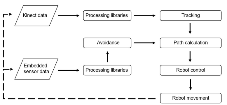 The system combined Microsoft Kinect for human detection with the robot’s embedded sensors for navigation and obstacle avoidance, using the potential field method to ensure safe, adaptive movement in real time.
