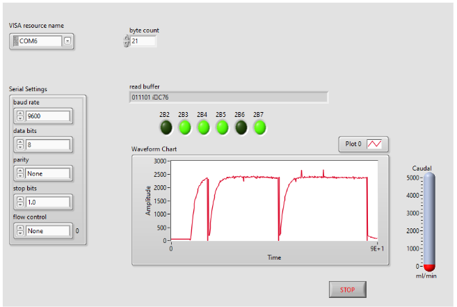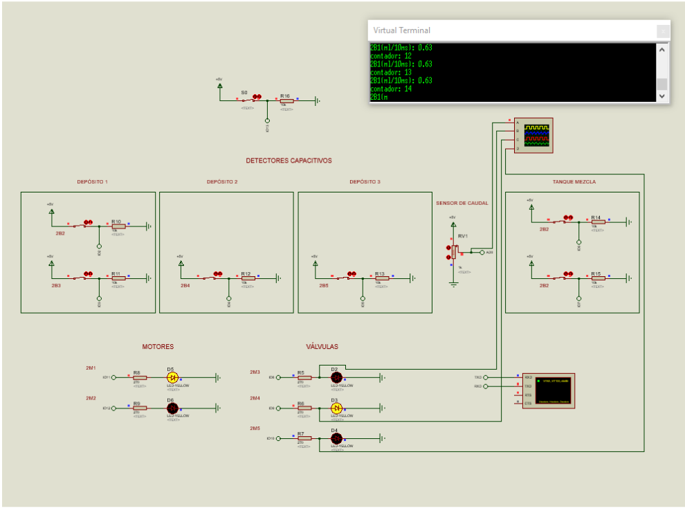 - Displayed sensor states (capacitive level detection) and real-time flow data.