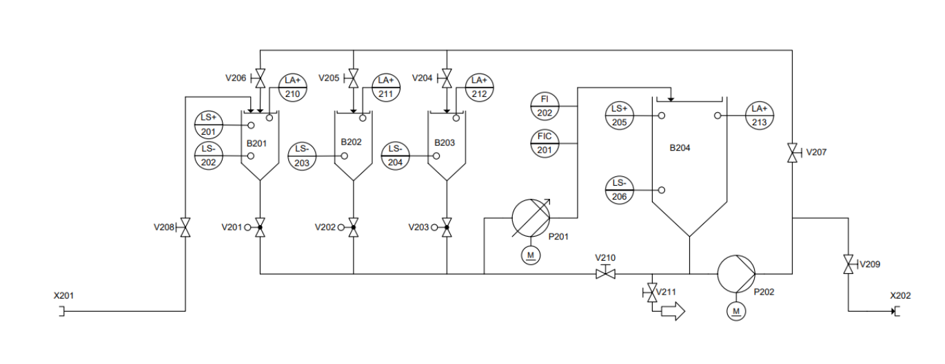 The station consisted of three dosing tanks and one main mixing tank, controlled by pumps and two-way ball valves. Sensors included capacitive level detectors and a paddle-wheel flow detector with a frequency-to-voltage converter.
